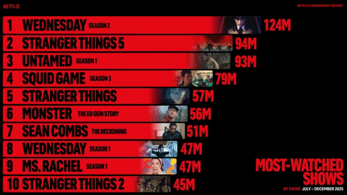 Нашумевший последний сезон «Очень странных дел» принес проекту 94 миллиона просмотров. Но главным сериалом полугодия стал «Уэнсдэй», его второй сезон собрал 124 миллиона просмотров.