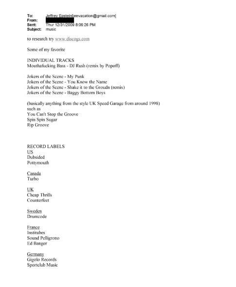 В одной из записей в «файлах Эпштейна» от 31 декабря 2009 года с засекреченного адреса с темой «музыка» нашлись рекомендации по части танцевальной электроники, где отправитель перечислил несколько любимых композиций и лейблов.