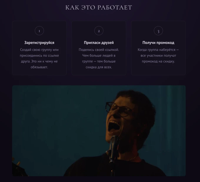 Музыкант Сергей Сироткин и его промокоманда разработали сервис для покупки билетов на ближайший концерт на московской площадке VK Stadium. На сайте можно создать собственную реферальную ссылку, по которой другие желающие будут покупать себе билеты со скидками — чем больше людей, тем меньше цена.