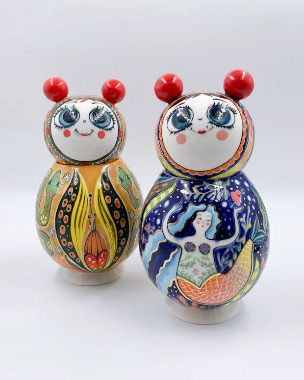 Мария Москвина создает посуду, украшения и предметы декора из фарфора. Бренд MMoskvina создан благодаря накопленному опыту работы в смешанной технике, а высшее художественное образование по специализации «народные ремесла» дало толчок к развитию темы народности в творчестве Марии и современному прочтению с детства знакомых образов.