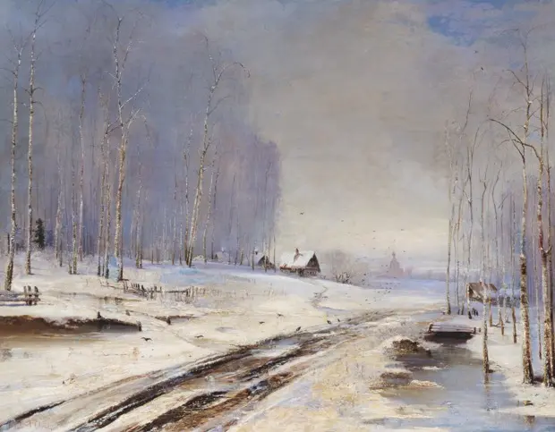 В этой работе, написанной в последние годы жизни мастера, он вновь обращается к теме перемен в природе. Саврасов мастерски передал переходное состояние между зимой и весной: снег еще не сошел полностью, но уже чувствуется дыхание весны. Голые ветви берез, талая вода, приглушенные цвета — все это создает особую лирическую атмосферу, характерную для творчества художника.