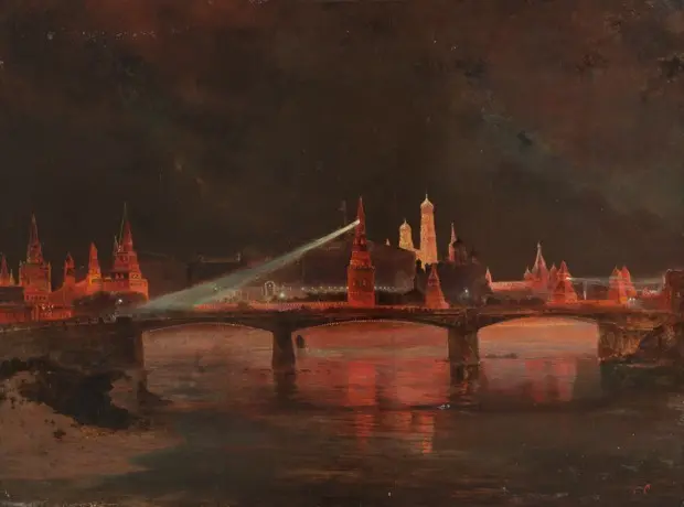 Эта работа относится к жанру ведуты — городского пейзажа. Саврасов мастерски передает атмосферу ночного праздника, изображая Кремль, вероятно, с противоположного берега Москвы-реки, через мост. Мы видим темное небо, мерцающие звезды — и на этом фоне величественный ансамбль Кремля, залитый тысячами огней. Башни и стены подсвечены так ярко, что кажется, будто сама история оживает перед вашими глазами.