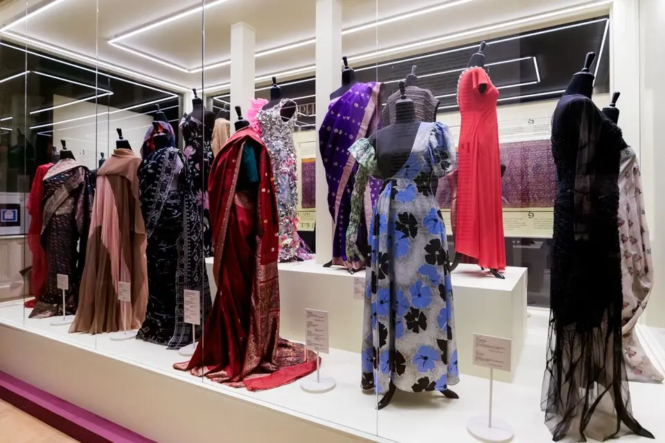 Финальный зал посвящен сари: его видам, способам драпировки, а также тому, как сари повлияло на глобальную трансформацию женского гардероба. В европейских платьях последних 100 лет неоднократно звучали его мотивы. Здесь широко представлены уникальные исторические артефакты — например, сари 2000-х годов Западной Бенгалии из коллекции Екатерины и Андрея Теребениных и платье 70-х годов Уильяма Травиллы, американского дизайнера, одевавшего Мэрилин Монро.