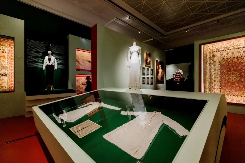 Поразиться дизайнерскому мастерству — однозначно в зале вышивки, где представлено золотное шитье, разные техники нанесения узоров, которые в большом количестве присутствуют в свадебных нарядах народов Индии и находят место и в европейской свадебной моде. До сих пор свадебный наряд, будучи одеждой для особого случая, остается лучшей иллюстрацией актуальности этого древнего искусства. В зале — белоснежная вышивка платья модного дома Татьяны Кочновой, золотное шитье на вечерних туалетах мировых брендов — Dolce & Gabbana и Saint Laurent. Стоит задержаться у самой лакомой витрины, где выставлена галерея дамских сумочек разных эпох — от маленьких вышитых батуа, непременного атрибута правительниц индийского княжества в ХIХ–ХХ веках, до легендарной модели Chanel 2.55 и современной кросс-боди.