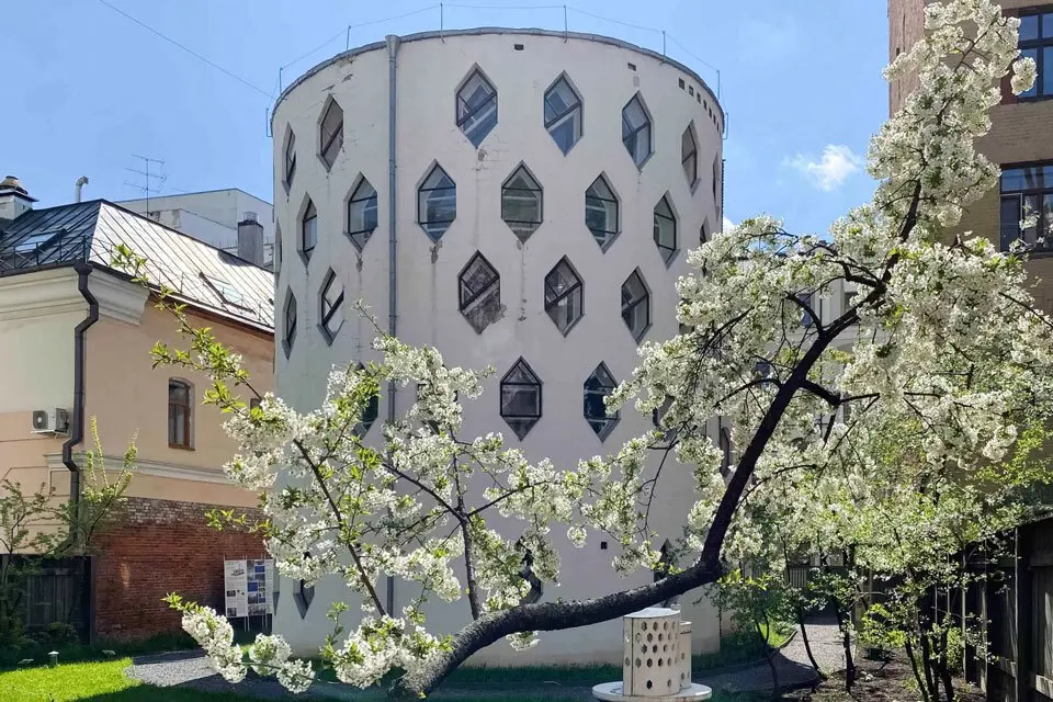 За неприметным деревянным забором в сердцевине переулка скрывается один из самых необычных домов Москвы. Это мастерская архитектора Константина Мельникова, возведенная в 1929 году. В 20-е годы зодчий активно проектировал клубы и гаражи для инфраструктуры города. Власти города выделили Мельникову участок земли и ссуду на 15 лет для строительства его собственного дома, который должен был стать экспериментальным образцом. В его проекте архитектор стремился опробовать идею круглого дома, которую планировал использовать в будущем при возведении цилиндрических домов-коммун. Их не появилось в должном количестве, но в своем доме архитектор прожил большую часть жизни. Сегодня легендарный дом — филиал Музея архитектуры, и его затяжная реконструкция скоро закончится. Это событие ждет вся Москва, чтобы вновь войти в «дом света»: его стены покрыты множеством маленьких окошек.