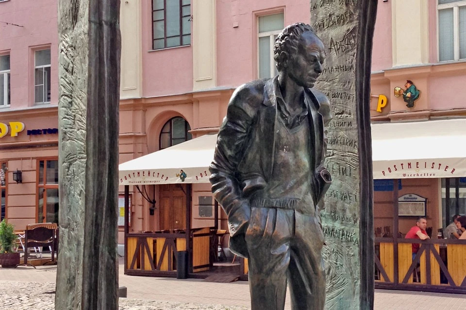 Памятник Булату Окуджаве на Арбате установили в 2002 году возле дома, где прошло детство поэта. Решение о создании монумента было принято вскоре после смерти Окуджавы. Скульптор Георгий Франгулян вместе с архитекторами Игорем Поповым и Валентином Прошляковым создали композицию, отражающую атмосферу старого арбатского двора. В памятнике можно увидеть булыжную мостовую, арки, скамейку, стол и дерево. Фигура поэта, выходящего из арки, символизирует не только его биографию, но и арбатскую городскую среду, которая стала важной темой его творчества. Сегодня памятник — символ Арбата и его культурного ореола.